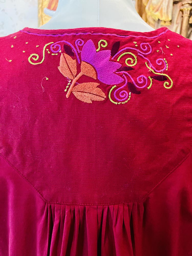 Det här är blusen som troligen tillhör samma kollektion som den stickade jackan från Gudrun Sjödén. Den är i en blandning av linne och bomull med broderier både fram och bak. Blusen är broderad i folklorestil, en av Gudruns specialiteter. Den knäpps med sju stycken knappar och två extra knappar sitter fastsydda på insidan. Den här blusen är helt ny och oanvänd men den tillverkades nog för cirka 15-20 år sedan. Tyvärr har jag inte lyckats få fram vilket år den gjordes. Storleken är en medium, men jag lämnar måtten då alla storlekar alltid varierar. Blusen mäter från ärmhåla till ärmhåla 50 X 2 cm. Från axel till nederkant mäter den ca 73 cm och ärmen mäter från sömmen från axeln till nederkanten ca 58 cm. Färgen är djupare röd än vad som syns på bilderna då belysningen gör färgen något annorlunda. Personligen tycker jag att den här kollektionen från Gudrun är en av de allra vackraste.