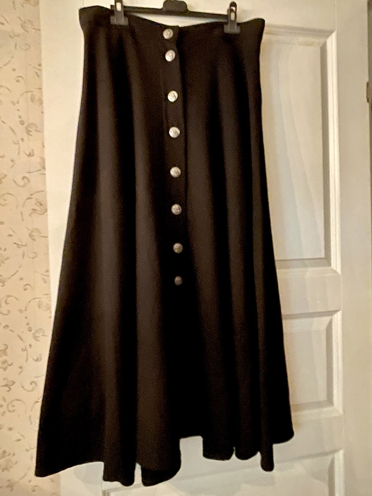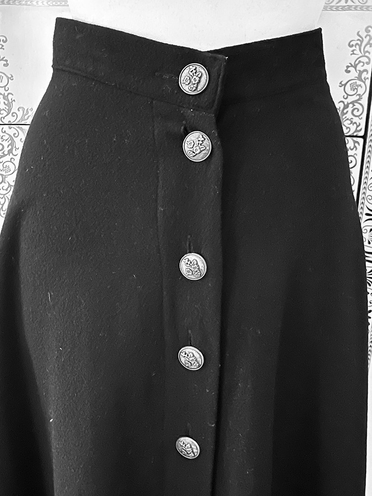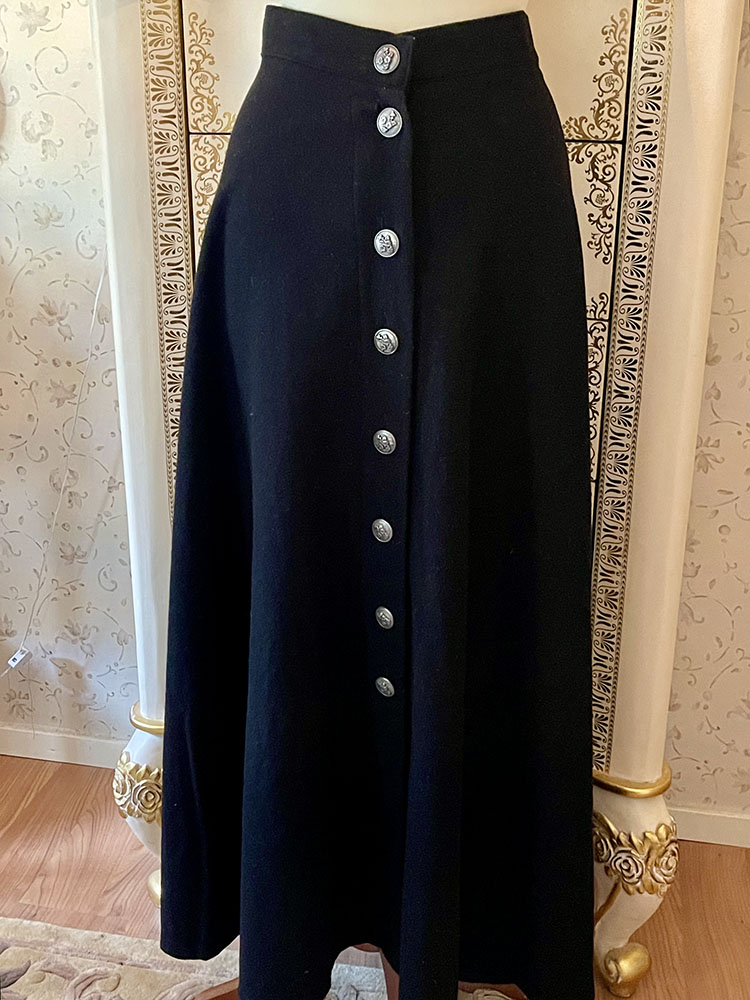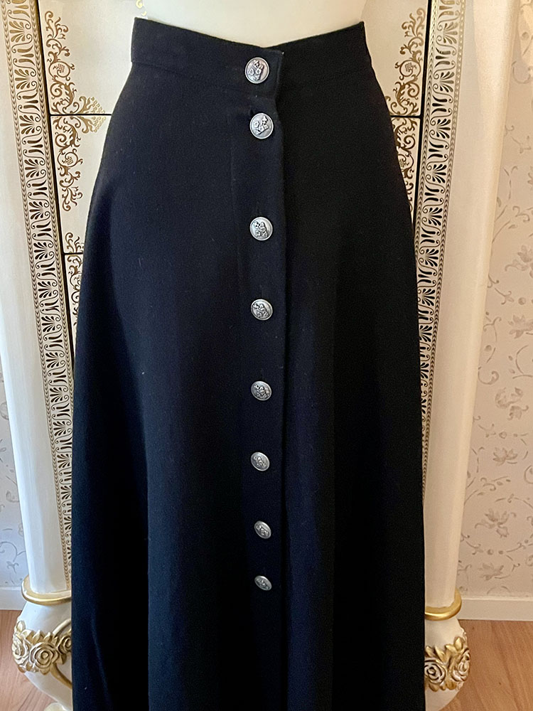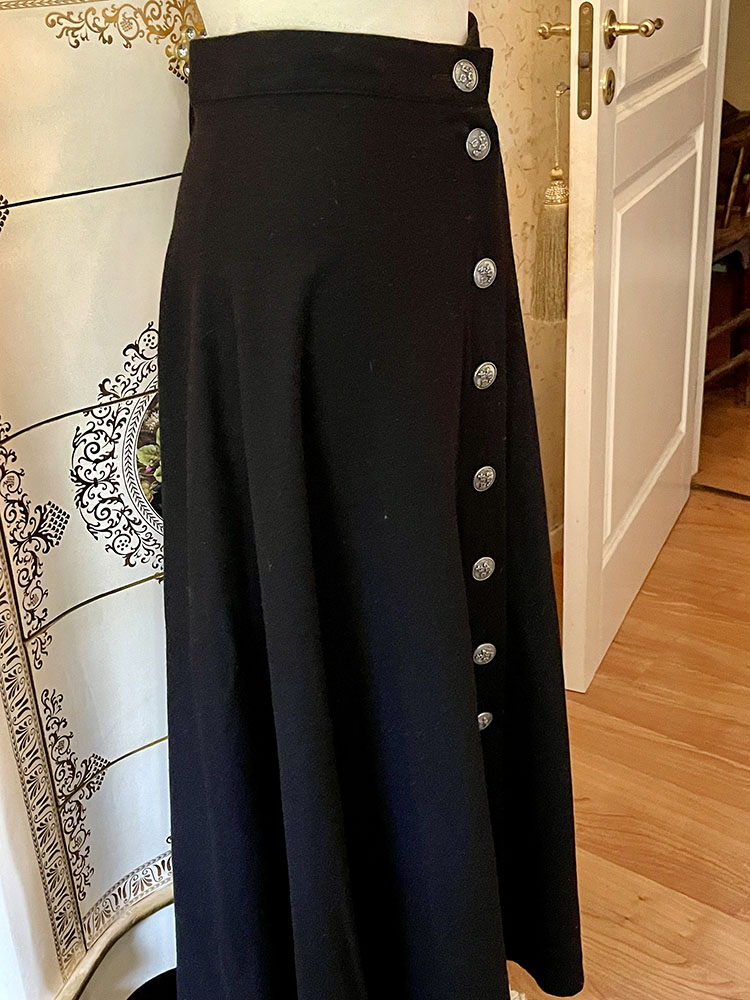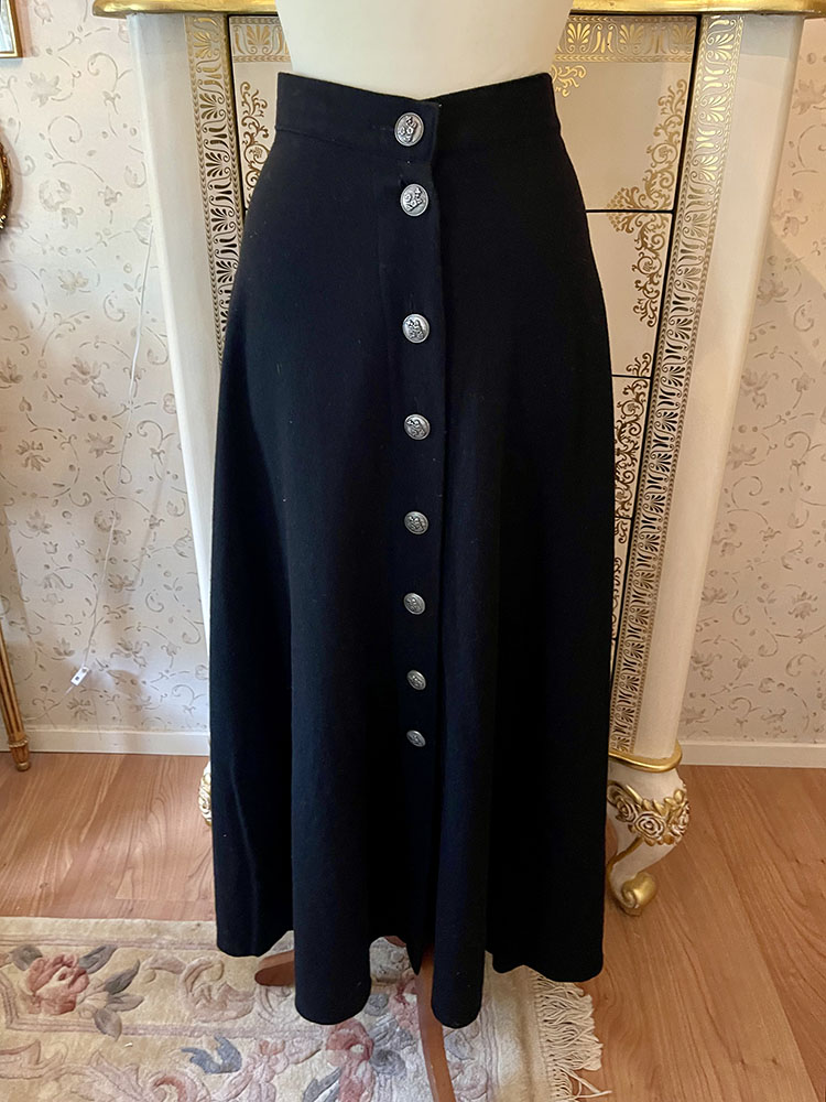 Här är en fantastisk kjol i ren ull som är en del av den norska Folkdräkten , även kallad Bunad.Den här kjolen är uppsydd på beställning vilket det oftast görs. I den här kvaliteten och ateljesydda är de svåra att finna. Oftast går de i arv från generation till generation. Kvaliteten på tyget är fantastiskt och framtill har den åtta knappar i vad jag tror är tenn. Den har ingen angiven storlek då den är uppsydd, men jag tror att man kan uppskatta den till en st 42-44. Måtten är, 45 cm X 2 och den är 93 cm lång. Jag kan se att de översta knapparna är utflyttade.Det är mycket mer vidd i de här kjolarna än man tror, den mäter nedtill runt om, 4,05 m mycket vidd. Folkdräkterna gjordes att förändras under tidens gång, man la ut och man tog in. Det är väldigt lätt att flytta in knapparna en decimeter om det behövs och sätta en hake på insidan för att hålla den på plats. Man kan även låta sy om den till de egna måtten, det lönar sig på grund av kvaliteten.