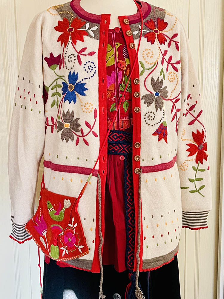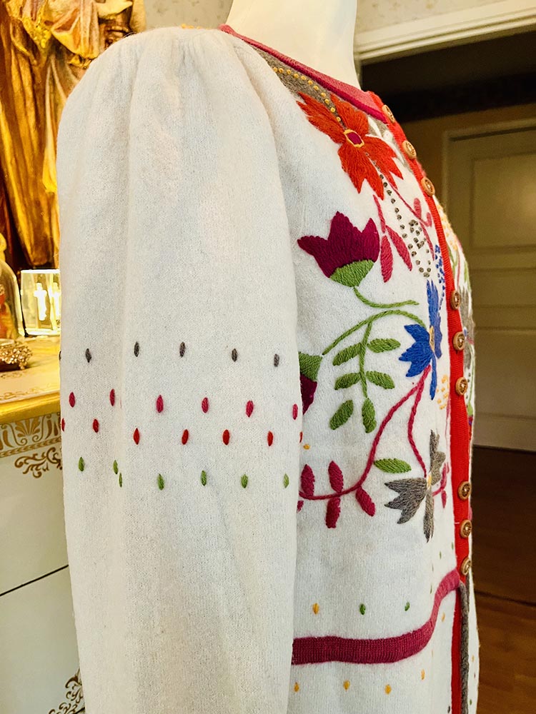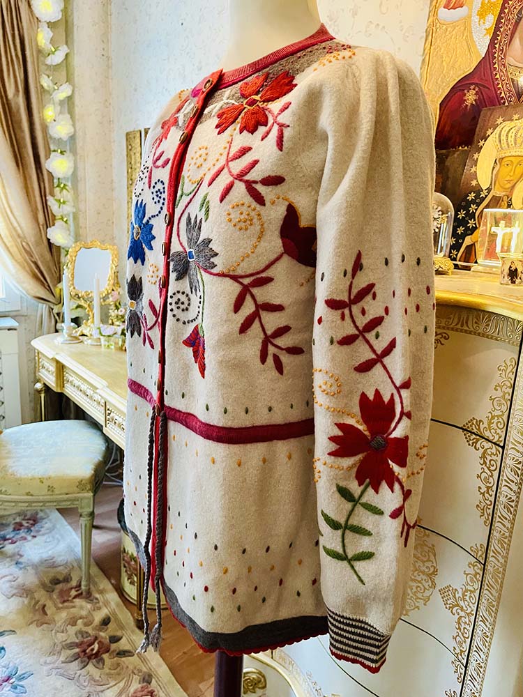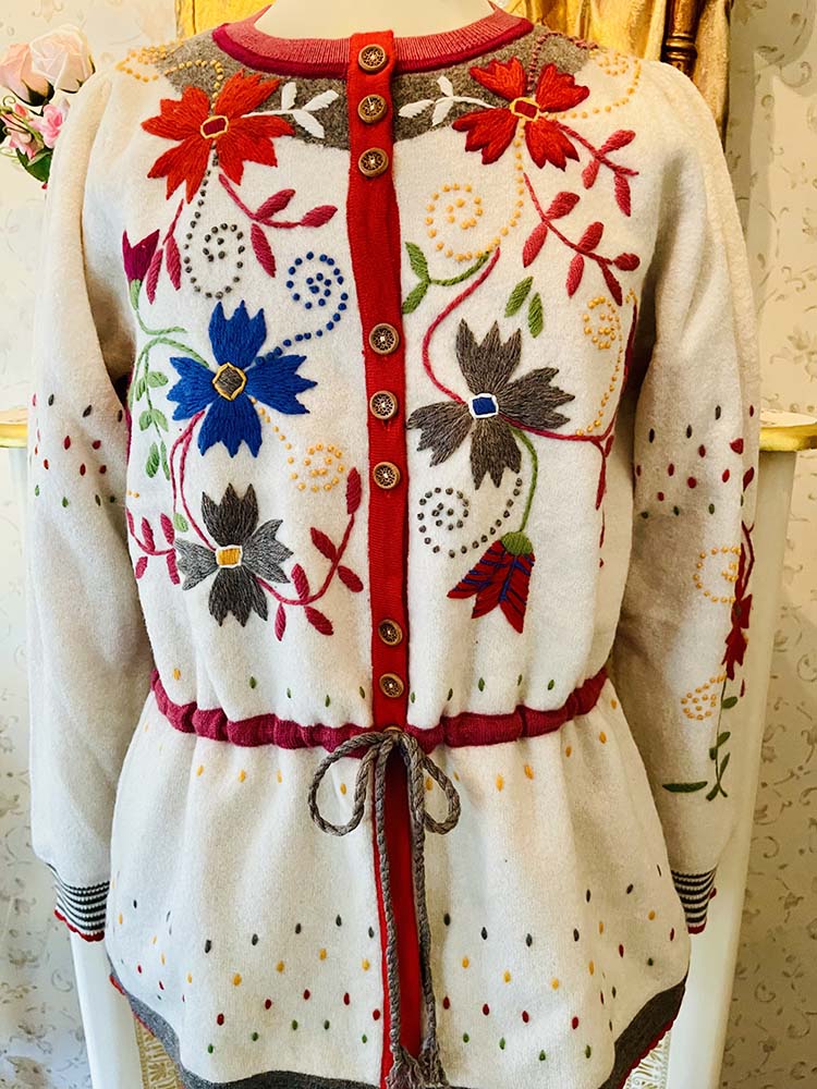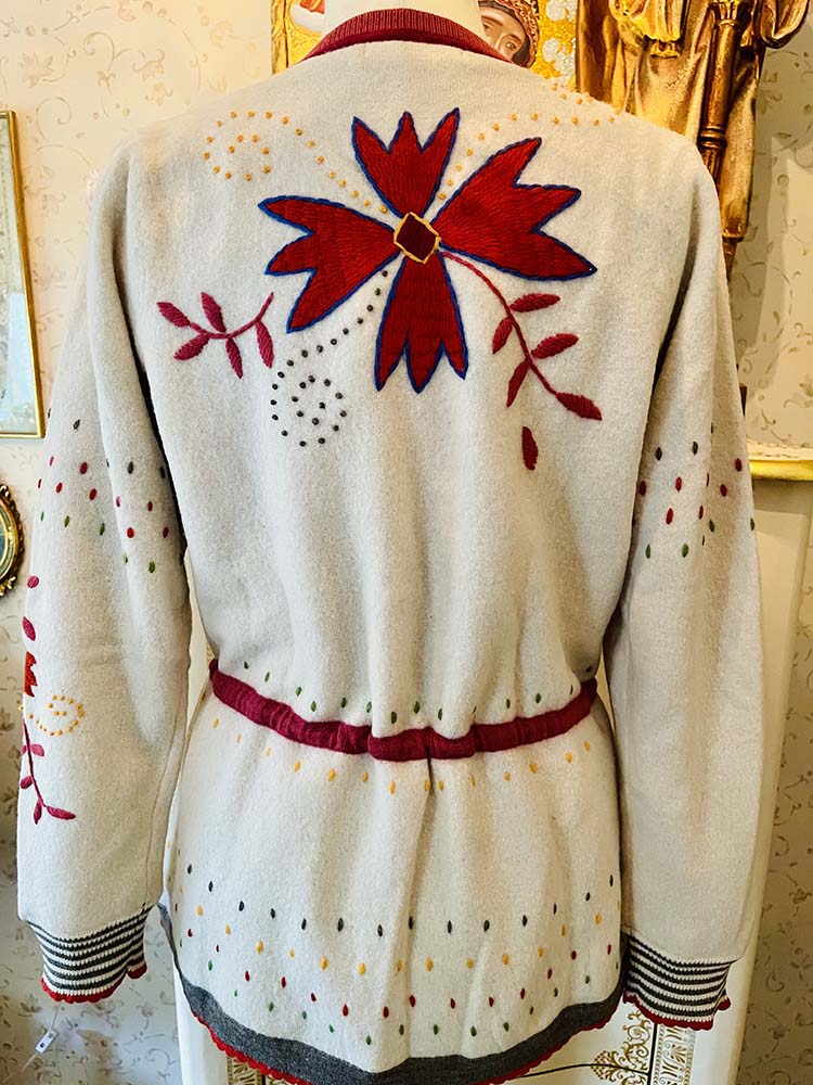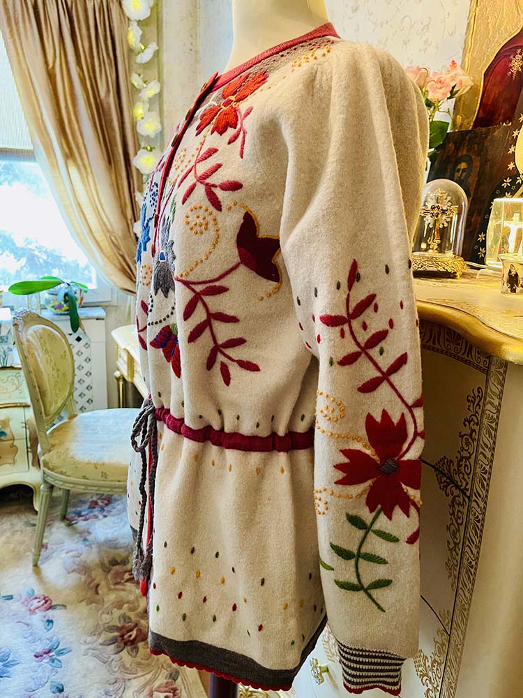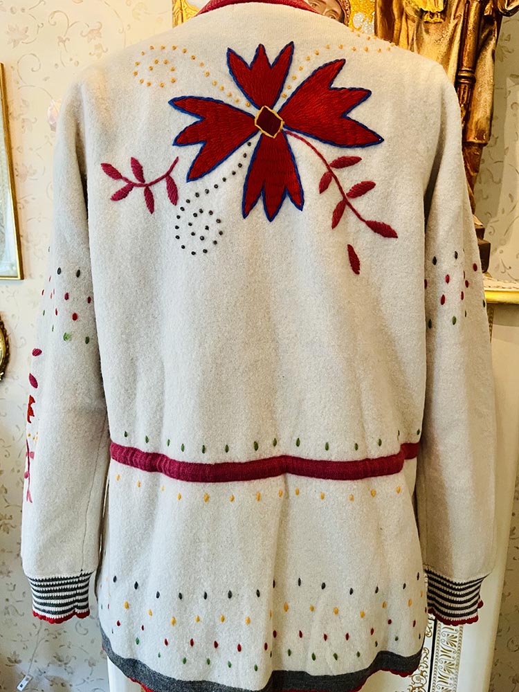 Det här är en stickad kofta/jacka från Gudrun Sjödén. Den är i tjock ull och har ett bomullsfoder. Hela jackan är broderad och i folklorestil, en av Gudruns specialiteter. Vid midjan sitter ett band så att man kan dra åt den om man vill. Den här jackan är helt ny och oanvänd men den tillverkades nog för cirka 15-20 år sedan. Tyvärr har Jag inte lyckats få fram vilket år den gjordes. Storleken är en medium, men jag lämnar måtten då alla storlekar alltid varierar. Jackan mäter från ärmhåla till ärmhåla 50 X 2 cm, Från axel till nederkant mäter den 70 cm och ärmen mäter från sömmen från axeln till nederkanten 65 cm. Koftan/jackan är tung då den är i ren ull. Personligen tycker jag att den här kollektionen från Gudrun är en av de allra vackraste.