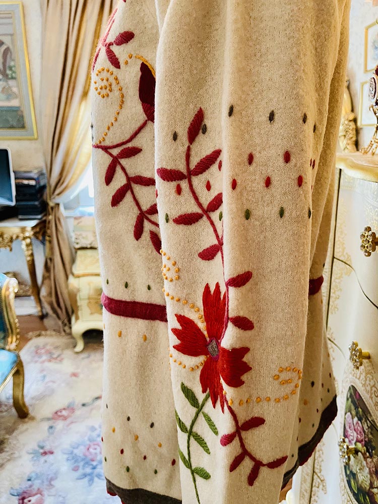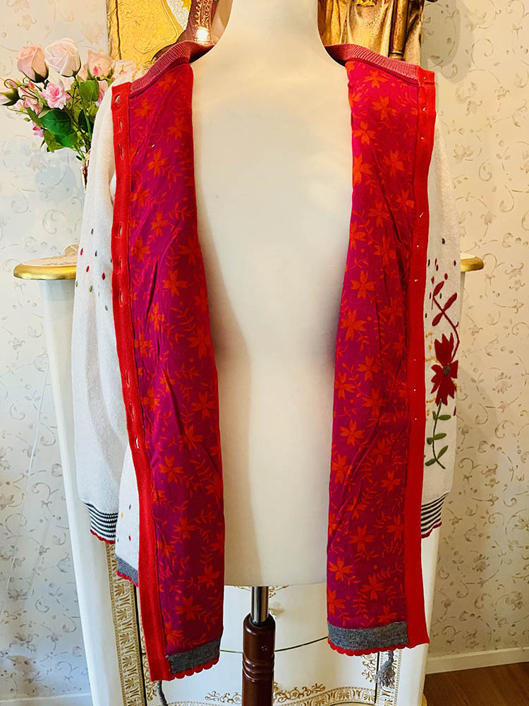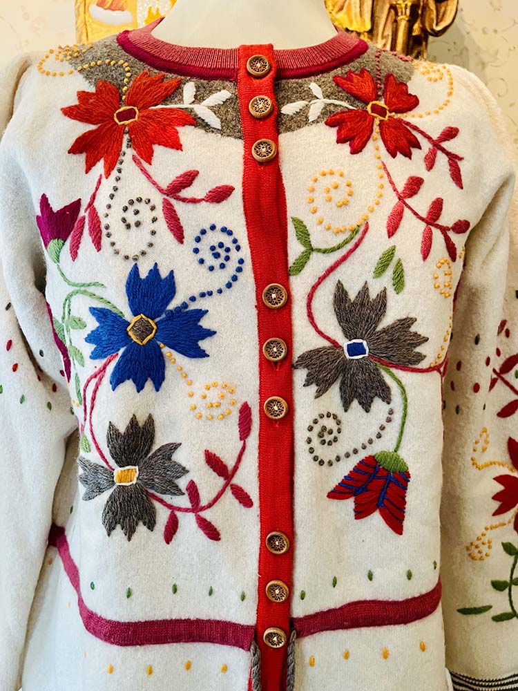 This is a knitted cardigan/jacket from Gudrun Sjödén. It is made of thick wool and has a cotton lining. The entire jacket is embroidered and in folklore style, one of Gudrun’s specialties. There is a ribbon at the waist so you can tighten it if you want. This jacket is brand new and unused but it was probably made about 15-20 years ago. Unfortunately I have not been able to find out what year it was made. The size is a medium, but I am leaving the measurements as all sizes always vary. The jacket measures from armhole to armhole 50 X 2 cm, From shoulder to hem it measures 70 cm and the sleeve measures from the seam from shoulder to hem 65 cm. The cardigan/jacket is heavy as it is made of pure wool. Personally, I think this collection from Gudrun is one of the most beautiful.