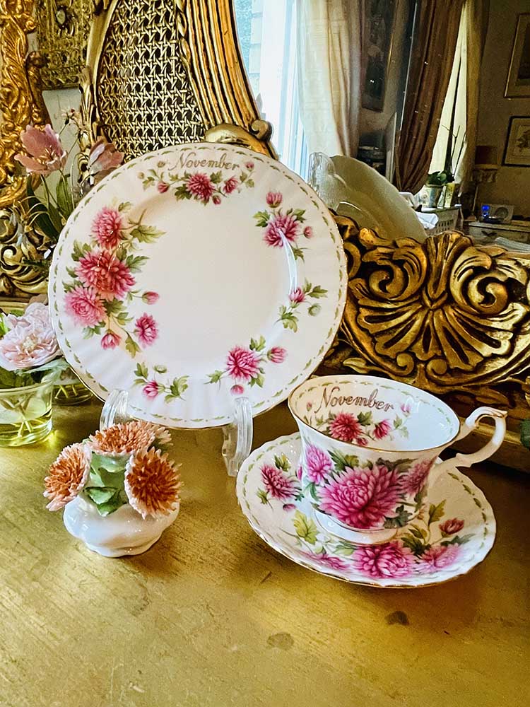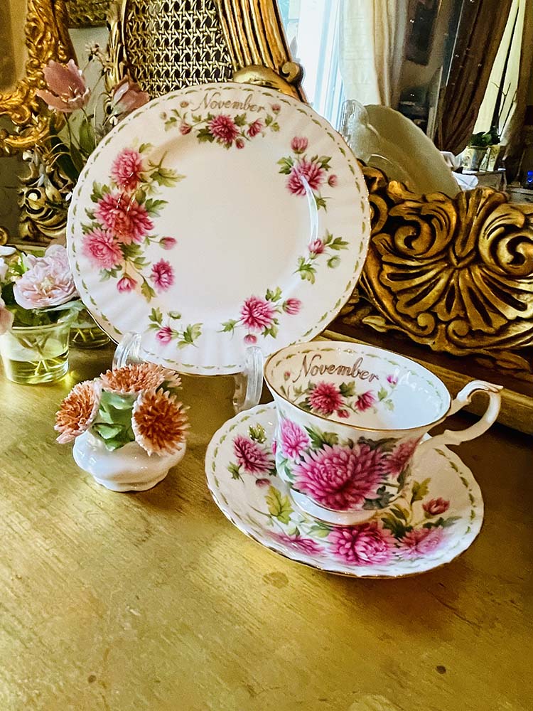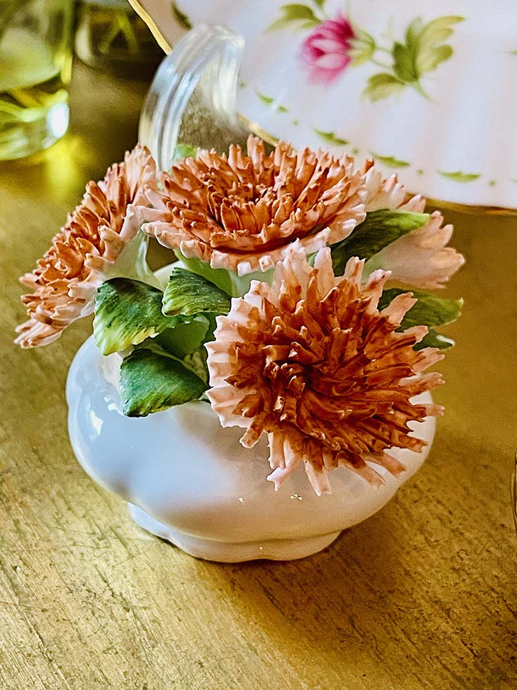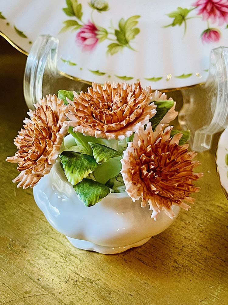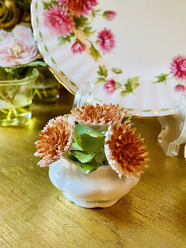 This is a series that Royal Albert began producing in 1940. In this appearance, it has been made since 1970 and production seems to have ceased not too long ago. I have seen it discontinued and then resumed, probably due to its popularity. The series is called Flower of the month. This is November’s table decoration. It depicts a bouquet of chrysanthemums in a small bowl. It is made of ceramic and porcelain. The decoration measures about 6 cm in height and about 8 cm across. It is in very good condition, and has no visible defects.