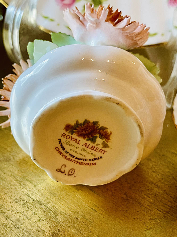 Det här är en serie som Royal Albert började tillverka 1940. I det här utseendet har den gjorts sedan 1970 och produktionen verkar ha upphört för inte alltför lång tid sedan. Jag har sett att den har lagts ner och sedan återupptagits, troligen på grund av sin popularitet. Serien heter Flower of the month. Det här är Novembers bordsdekoration. Den föreställer en bukett krysantemum i en liten skål. Den är tillverkad i keramik och porslin. Dekorationen mäter ca 6 cm på höjden och rakt över ca 8 cm. Den är i mycket fint skick, och har inga synliga defekter.